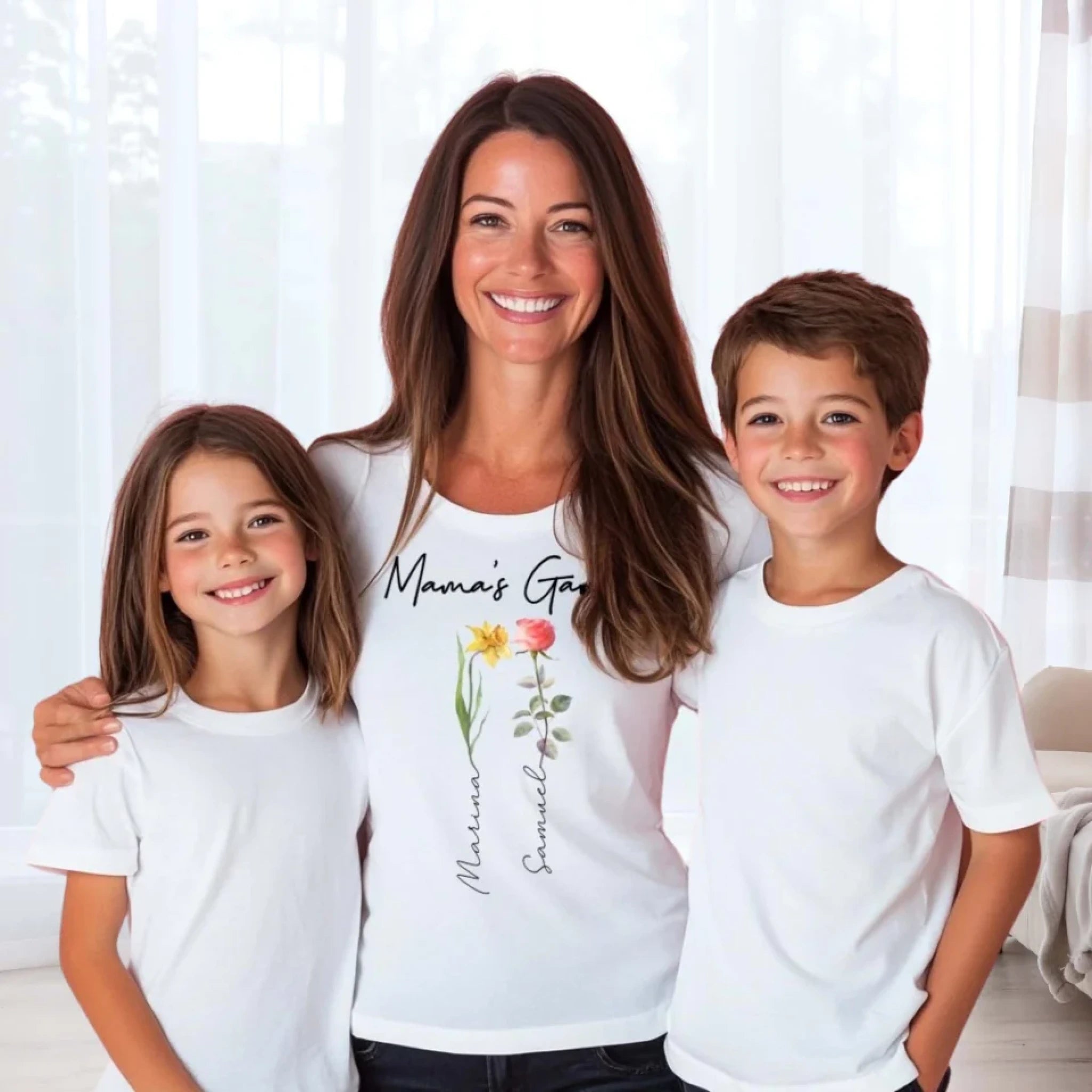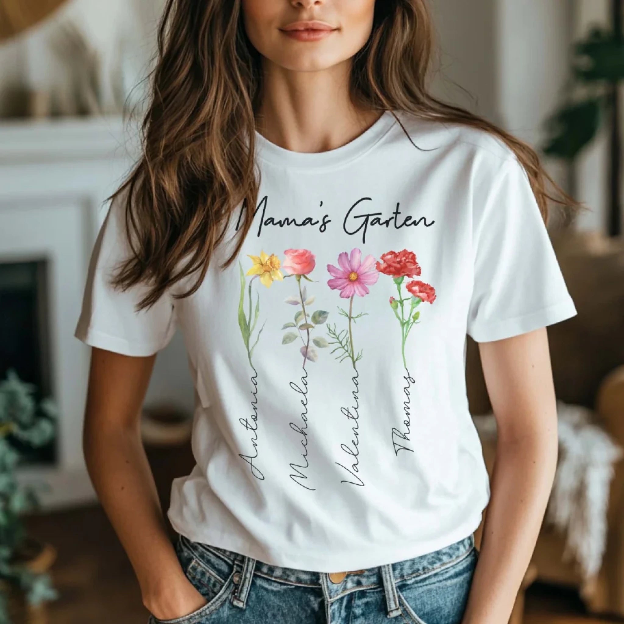 Jede Mama pflegt ihren ganz eigenen Garten – voller Blumen, die für ihre Kinder stehen. Unser personalisiertes T-Shirt macht diese Liebe sichtbar.