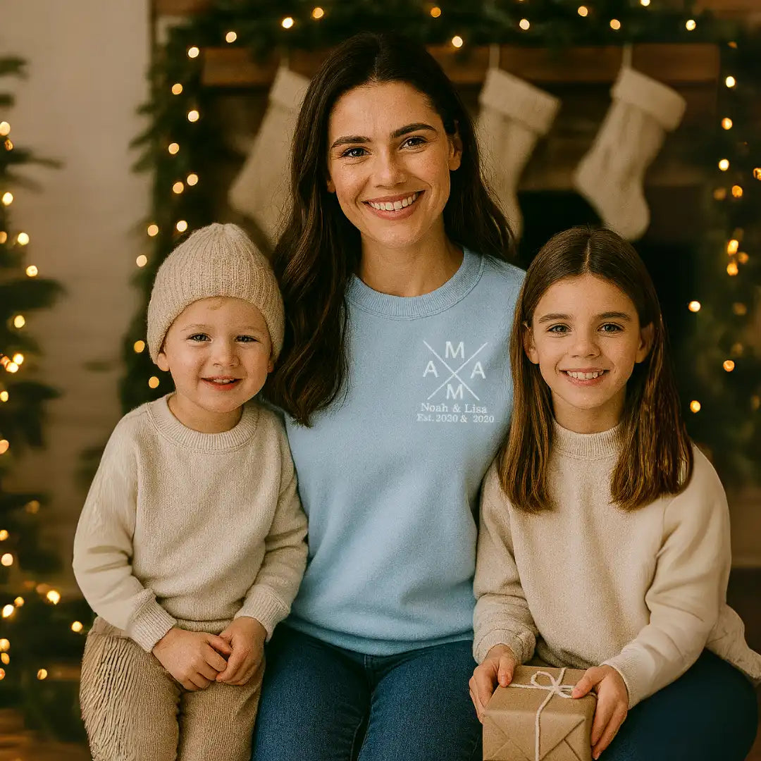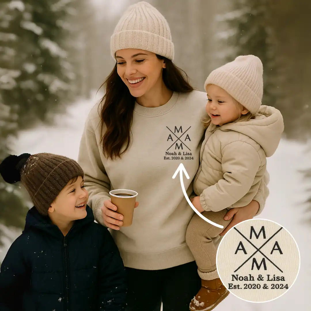 Die individuelle Bestickung macht jedes Sweatshirt zu einem echten Unikat. WĂ€hle die Namen und Geburtsjahren der Kinder und erschaffe ein LieblingsstĂŒck, das Mama immer an ihre besondere Rolle erinnert.