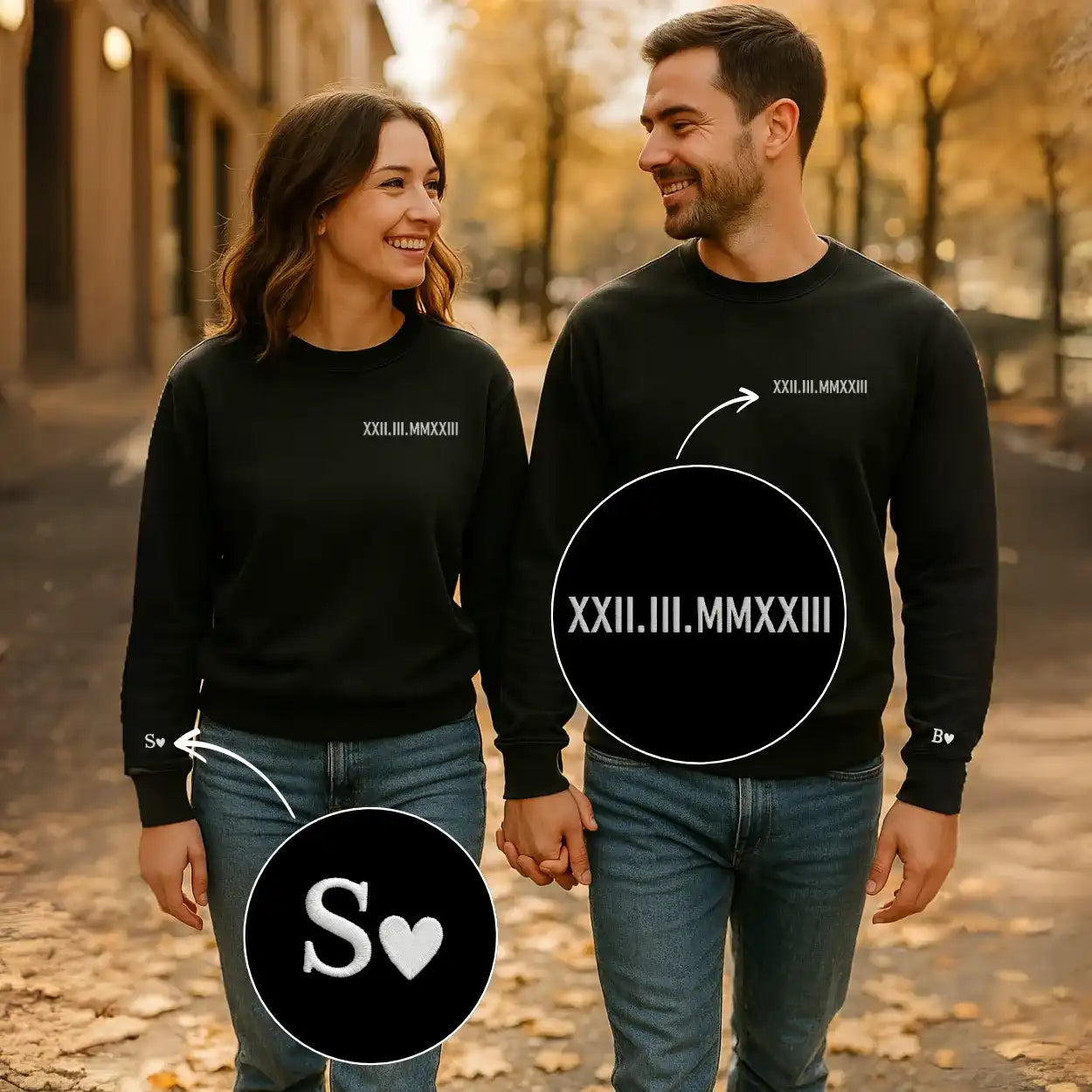 Personalisiere eure Matching Sweatshirts mit eurem Datum und euren Initialen auf dem Ärmel, um es zu einem ganz persönlichen Geschenk zu machen.